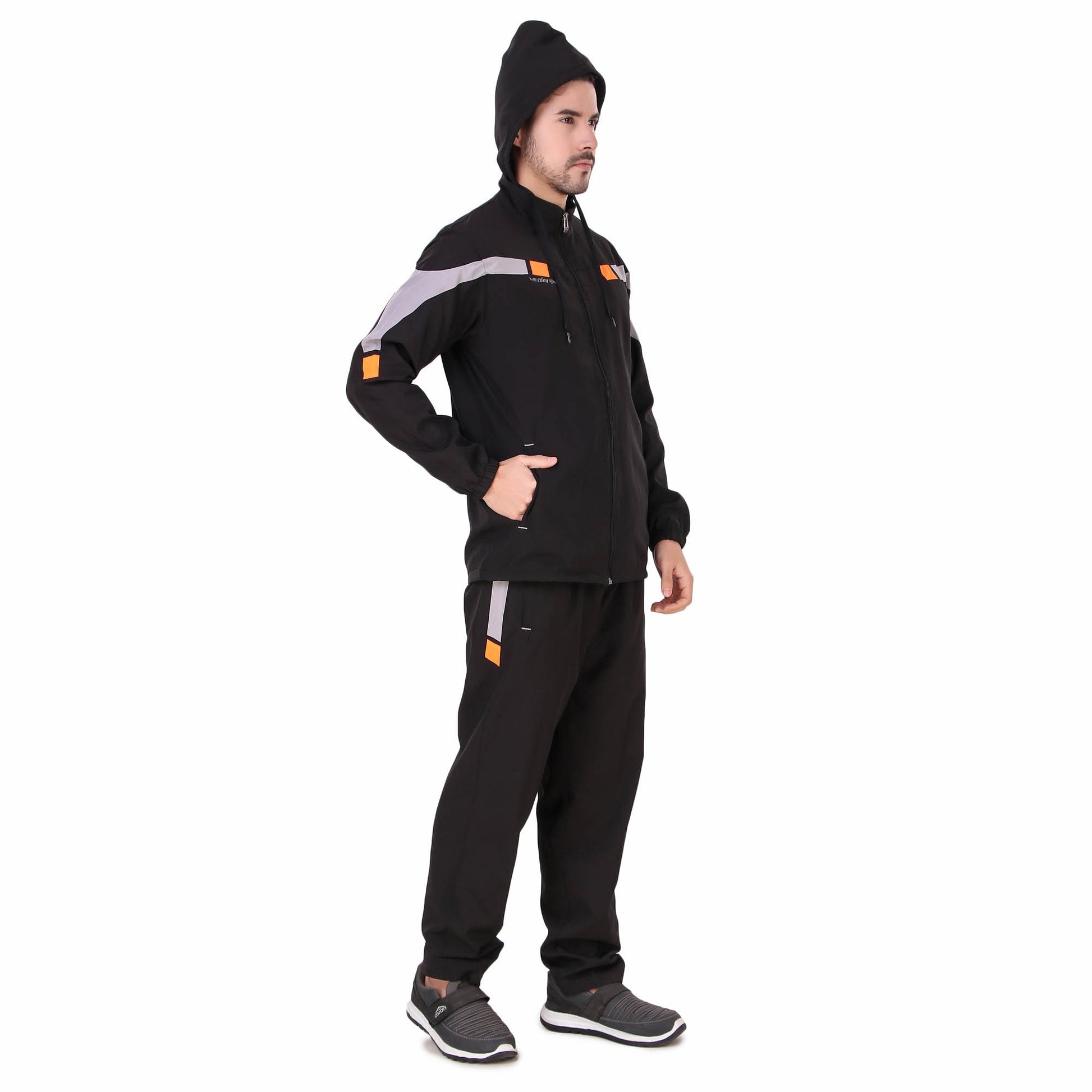 Design: Modern full zip jacket paired with tapered pants for a streamlined look